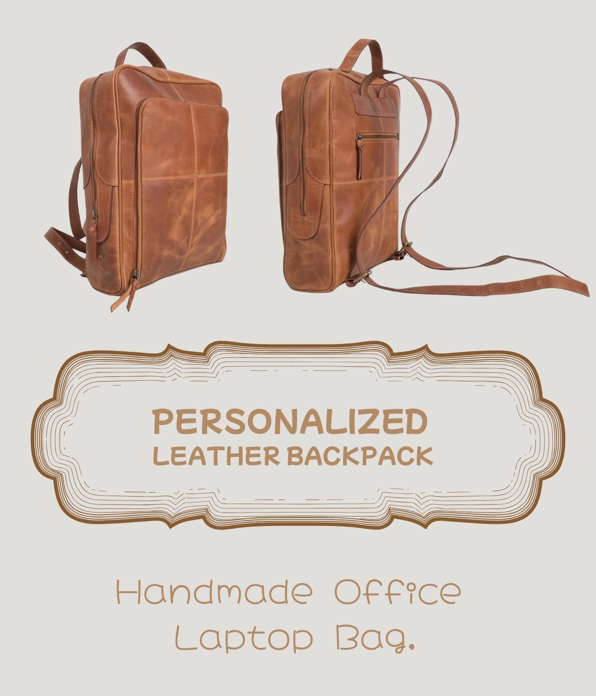 Personalised Leather Backpack, Handmade Office Laptop Bag, Work Bag, Tan High Quality Leather Bag, Gift For Him, Christmas, Anniversary Gift