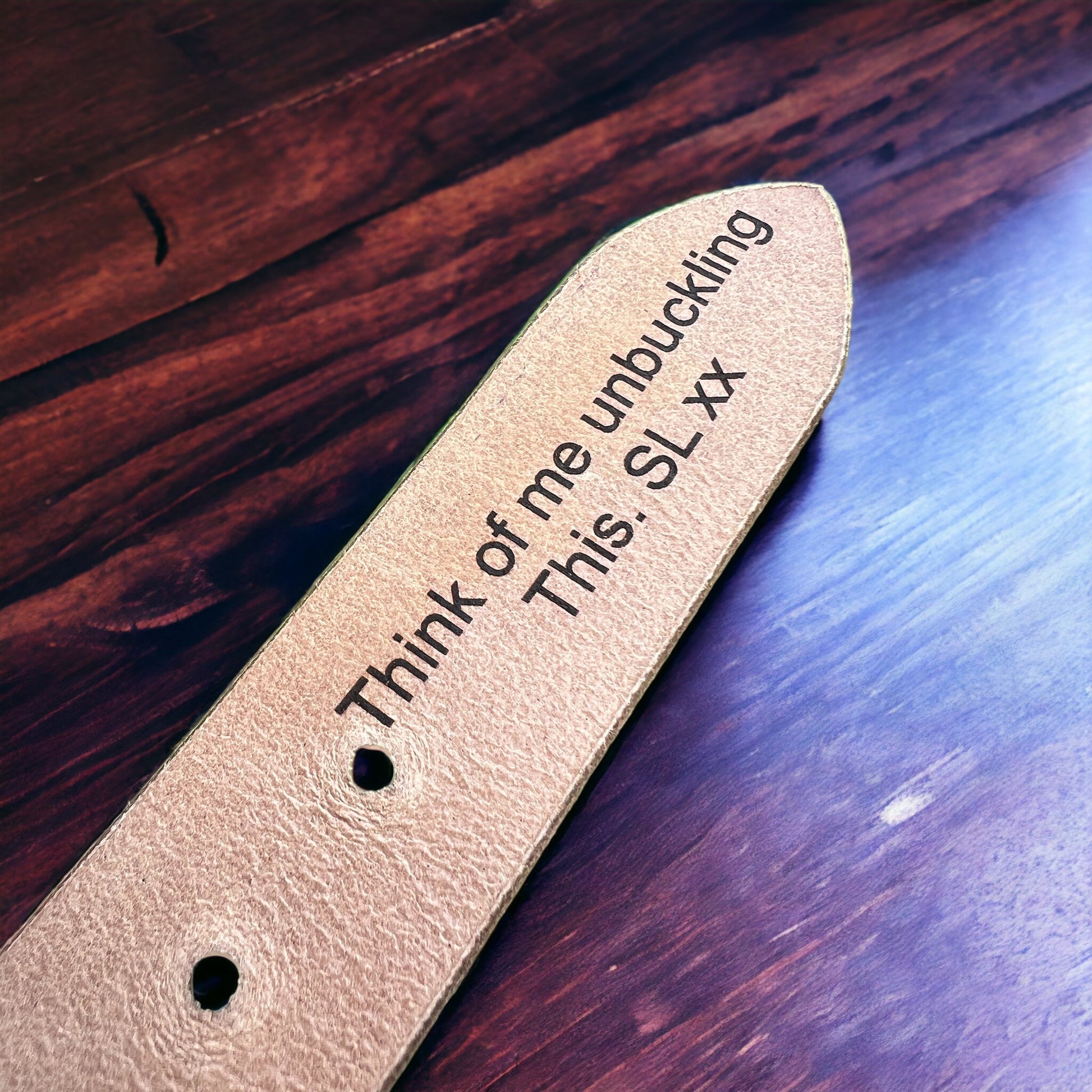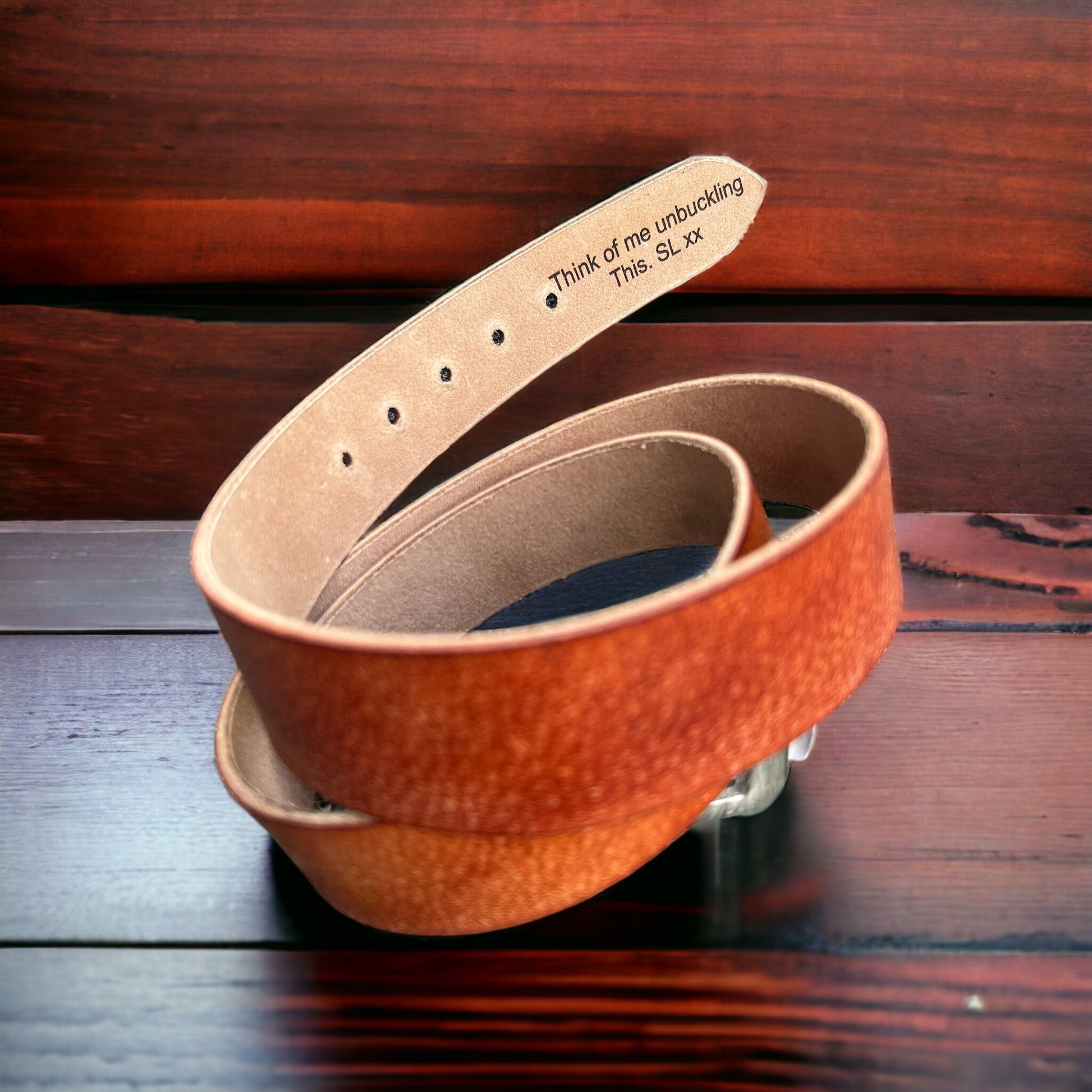 But the personal touch doesn't stop there. On the inside of the belt, we offer the option to include a heartfelt message or a motivational quote. Whether it's a reminder of your values, a special date, or a message to carry with you throughout your day, this hidden inscription adds a layer of intimacy to your accessory.